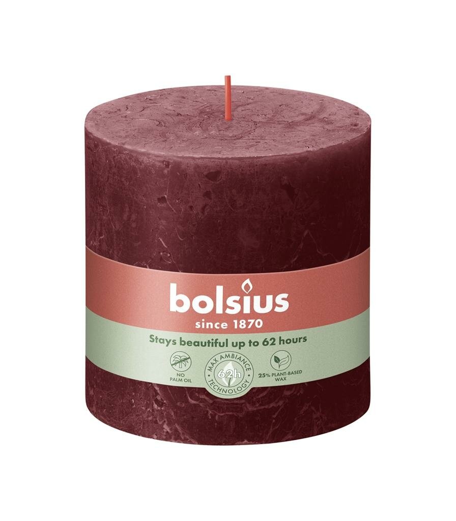 Rustieke sfeermaker voor je interieur. Bolsius kaars rustiek 10x10 cm velvet red is een prachtige stompkaars die direct sfeer toevoegt aan je interieur. Deze vernieuwde rustieke kaars van Bolsius is geïnspireerd door de kleuren en texturen uit de natuur. Met zijn prachtige tint, vormt deze kaars een stijlvolle aanvulling op je woondecoratie. De kaars is gemaakt van plantaardige was zonder dierlijke vetten en heeft een katoenen lontje voor een schone verbranding.