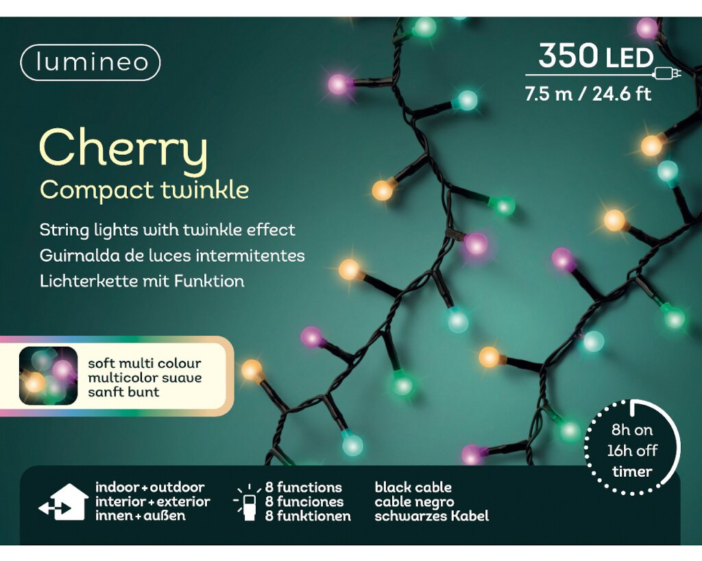 Led cherry lights compact 350 lamps soft multi colour van Lumineo is een decoratieve kerstverlichting die je kerstboom transformeert tot een ware blikvanger. Deze sfeervolle verlichting bestaat uit 350 soft multi colour LED-lampjes met bolletjes wat zorgt voor een speels en levendig lichteffect. Bij deze compact-variant zitten de bolletjes dichter op elkaar, waardoor je kerstboom een prachtige, volle uitstraling krijgt.